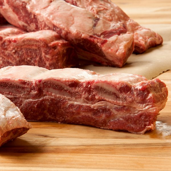 Flanken-style short ribs are cut across the bone into thin strips, exposing several small sections of bone surrounded...